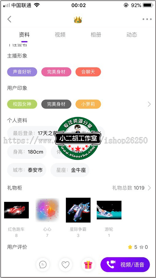 主播详情页介绍:主要分为两部分显示,优先展示主播上传的个人图片及小视频内容,以及主播基本资料内容;上滑显示主播详细介绍资料,主播形象标签、用户印象标签、主播礼物柜等内容。