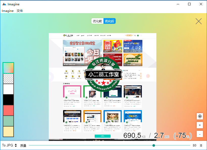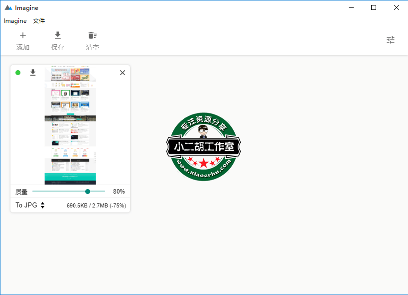 软件支持手动选择文件,以及拖移图片至软件。值得一提的是,不仅仅可以在设置同一修改图片压缩质量,也可以在主界面单独图片修改。可以单独图片导出,也可以选择保存而批量导出。毫无疑问,这是一款异常优秀的的图片压缩软件,具有简洁的UI和人性化的功能设计!
